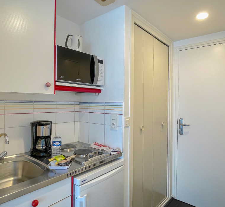 - Petite kitchenette avec 2 plaques de cuisson, frigo table top, micro-ondes, cafetière électrique à filtre et bouilloire