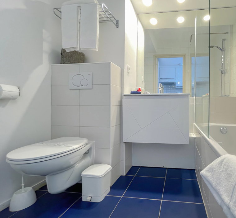 • Salle de bains avec baignoire ou douche (selon disponibilité) et WC, sèche-cheveux